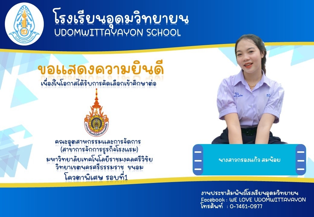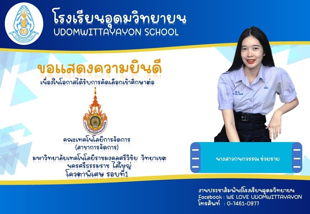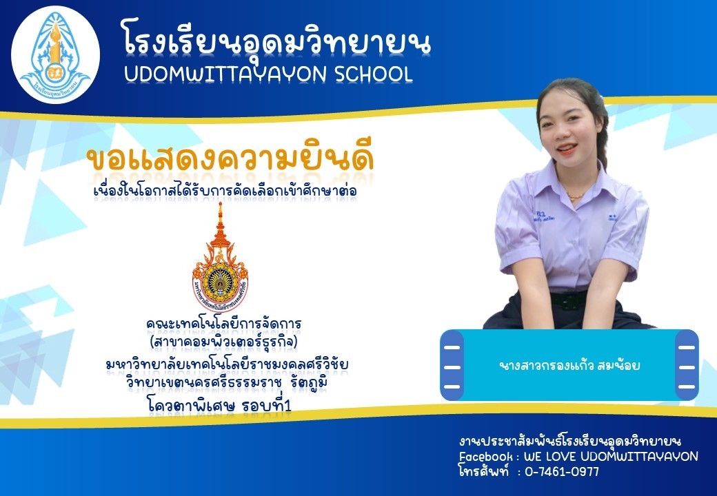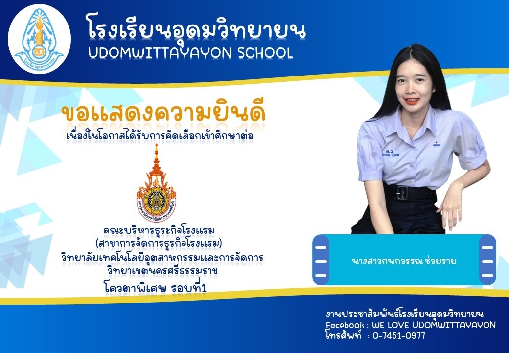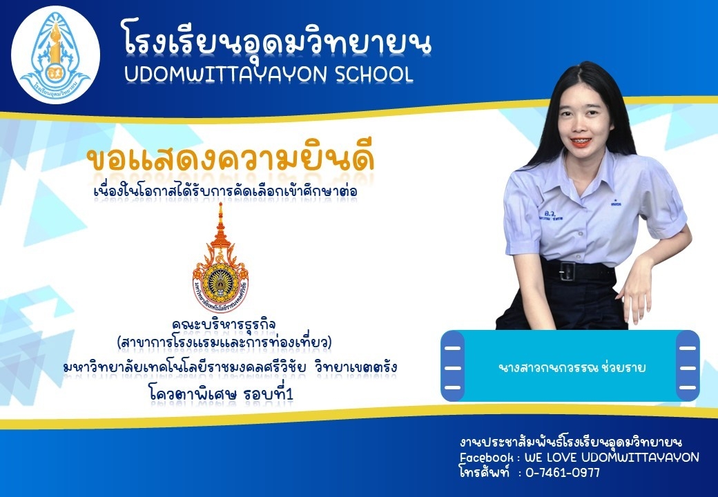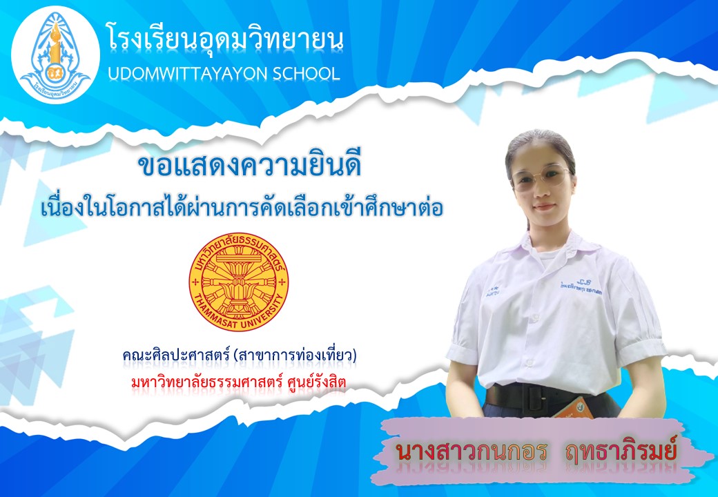 โรงเรียนอุดมวิทยายน ขอแสดงความยินดีกับนักเรียนระดับชั้นมัธยมศึกษาปีที่ 6 ในโอกาสจบการศึกษา ปีการศึกษา 2565  และผ่านการคัดเลือกเข้าศึกษาต่อในระดับต่างๆ