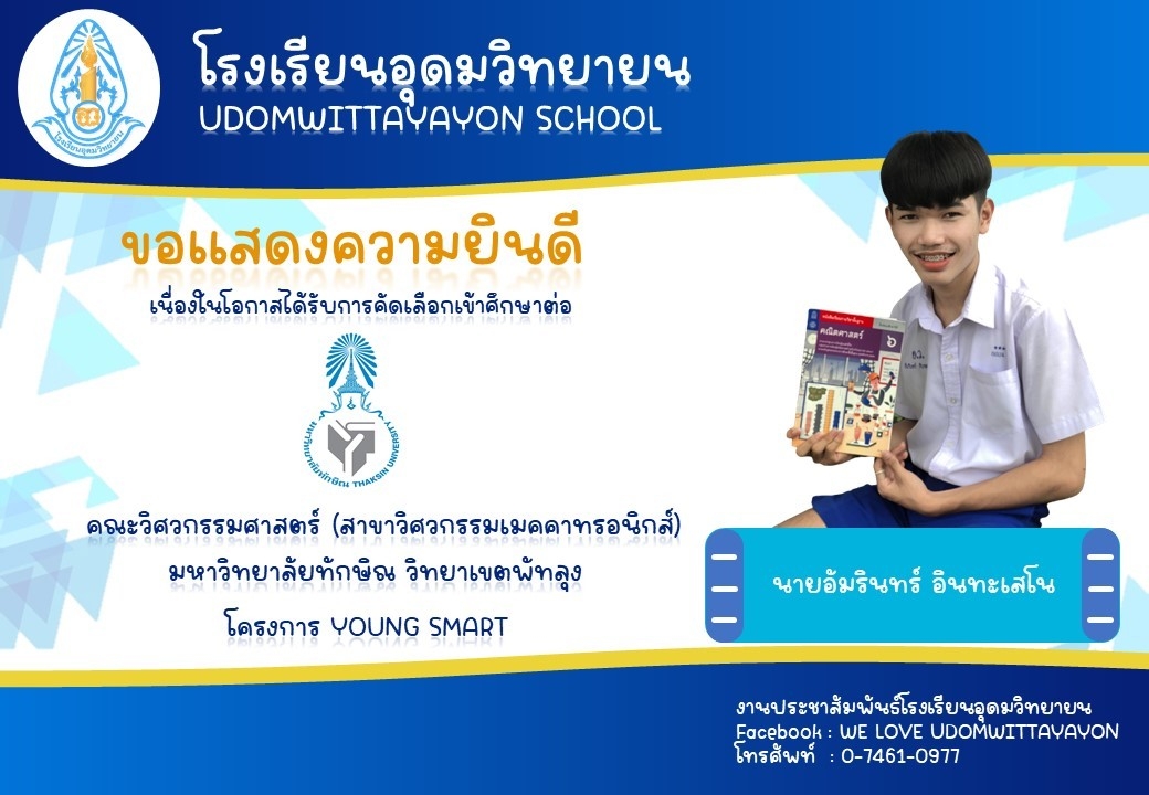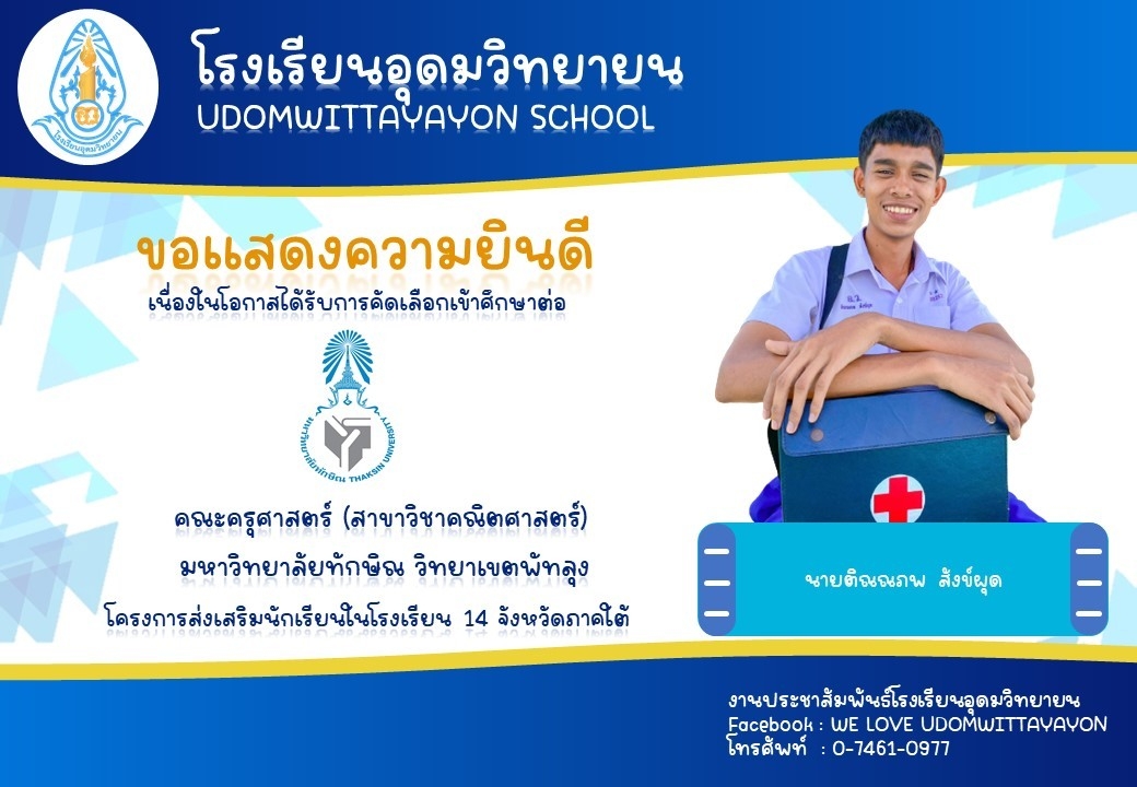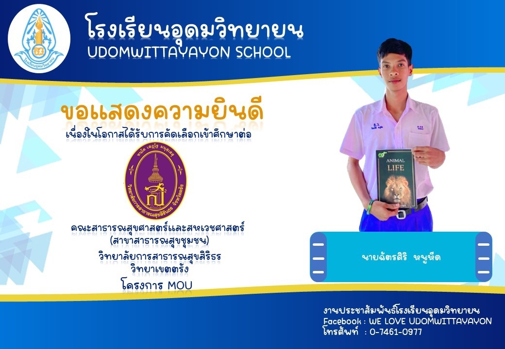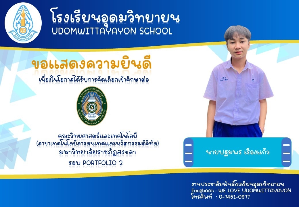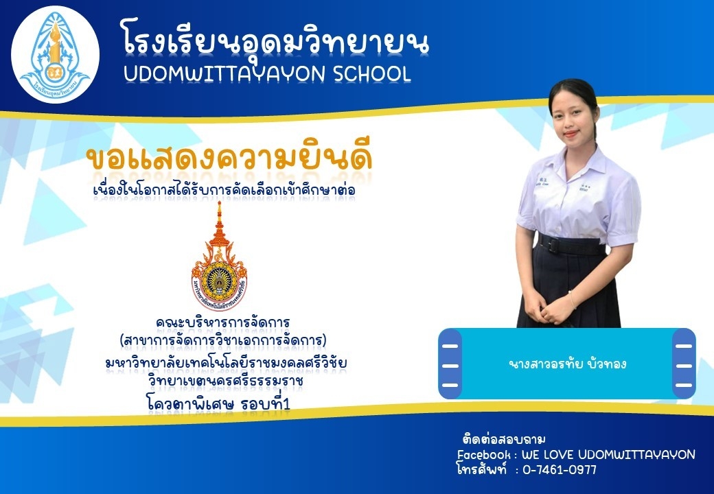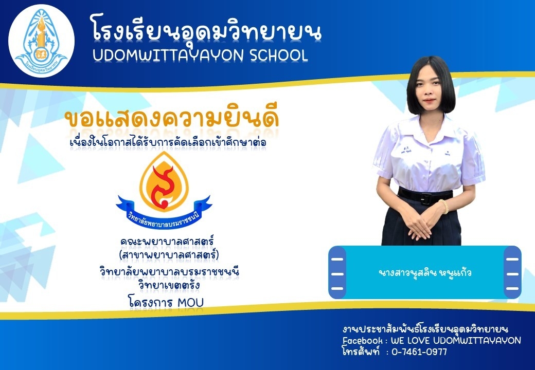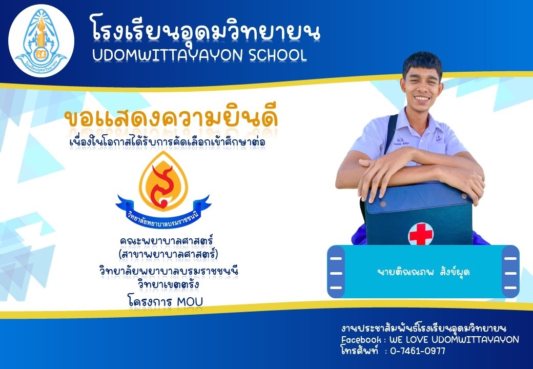 โรงเรียนอุดมวิทยายน ขอแสดงความยินดีกับนักเรียนระดับชั้นมัธยมศึกษาปีที่ 6 ในโอกาสจบการศึกษา ปีการศึกษา 2565  และผ่านการคัดเลือกเข้าศึกษาต่อในระดับต่างๆ