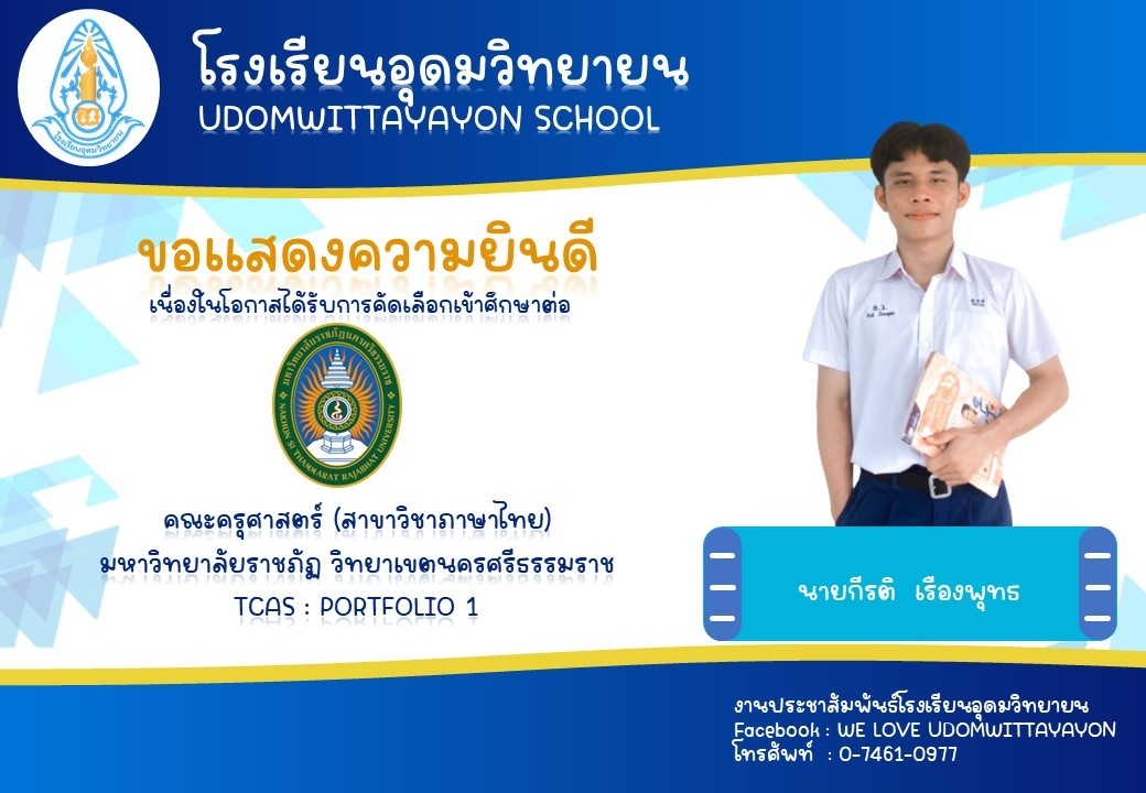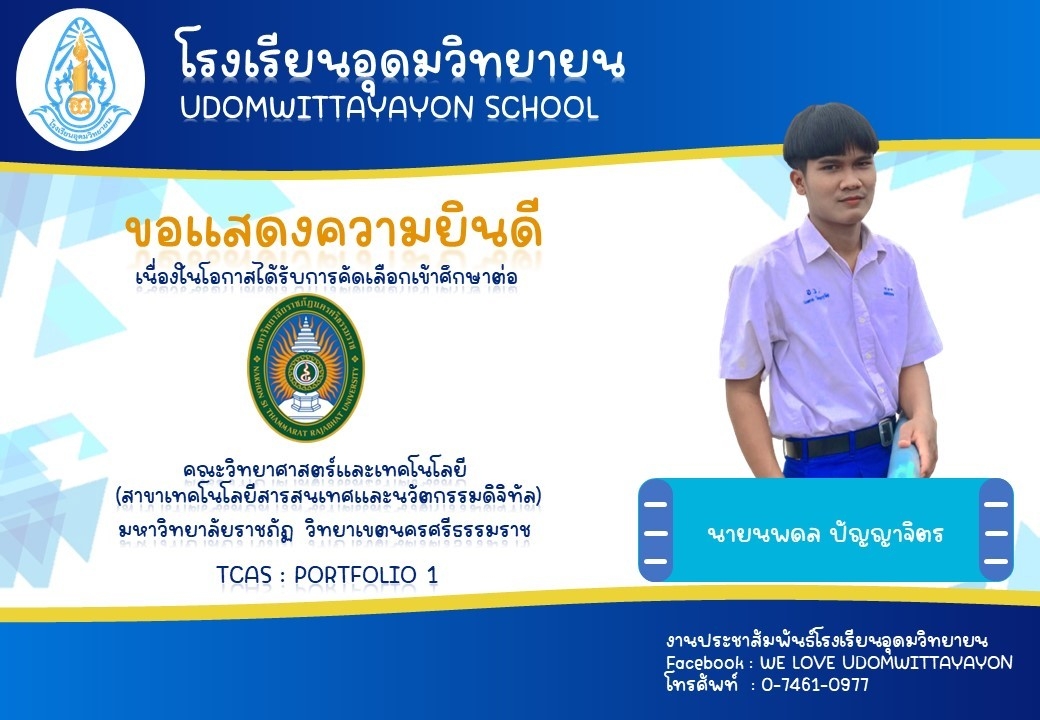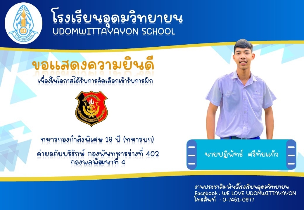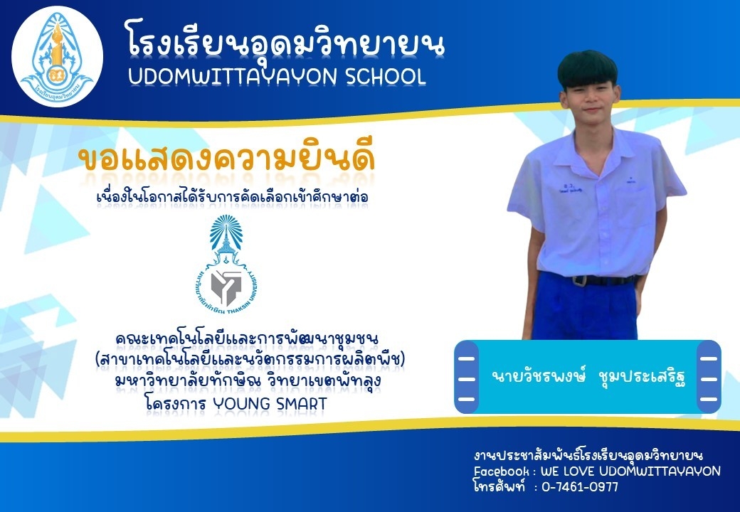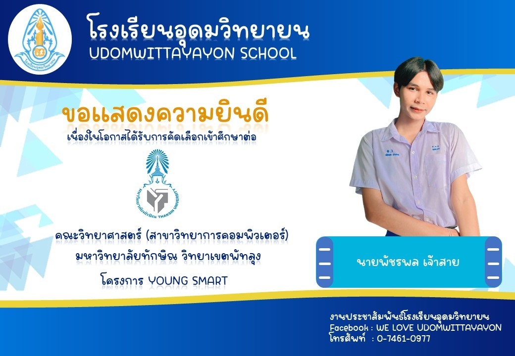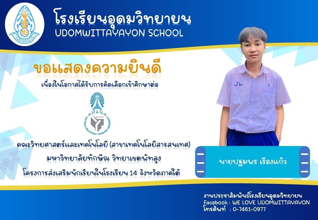 โรงเรียนอุดมวิทยายน ขอแสดงความยินดีกับนักเรียนระดับชั้นมัธยมศึกษาปีที่ 6 ในโอกาสจบการศึกษา ปีการศึกษา 2565  และผ่านการคัดเลือกเข้าศึกษาต่อในระดับต่างๆ