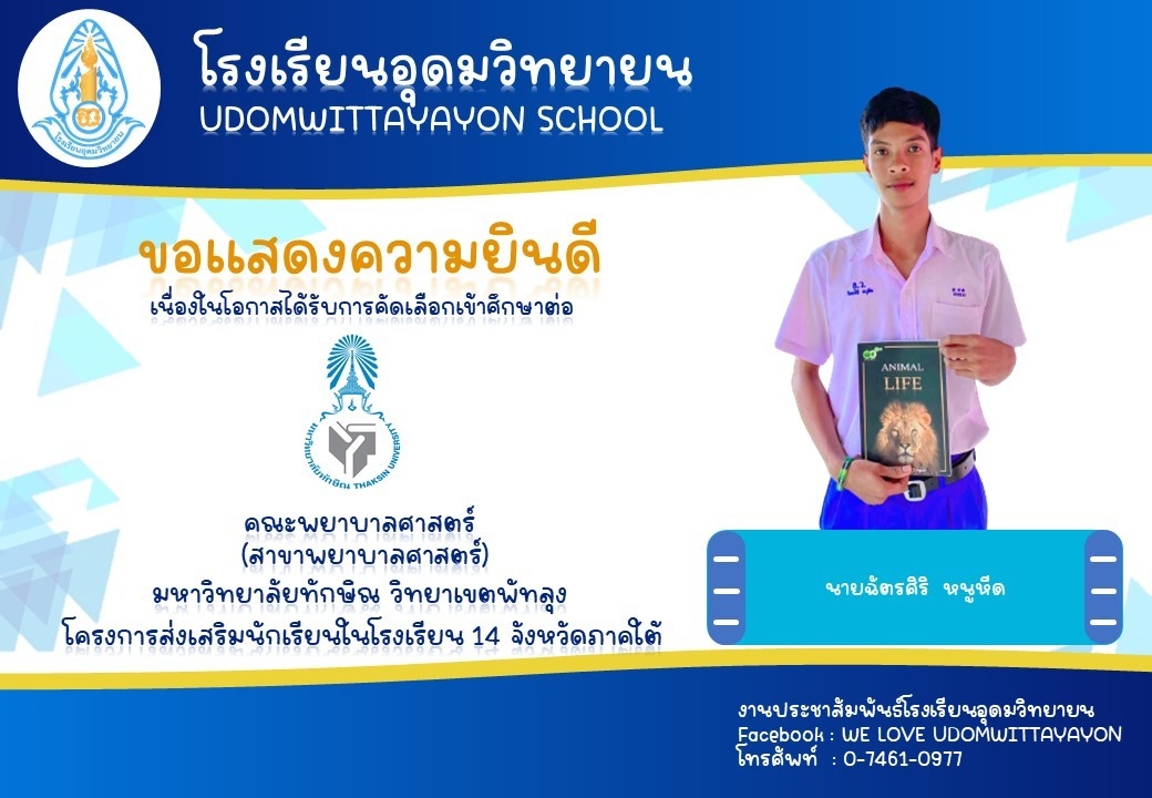 โรงเรียนอุดมวิทยายน 46 หมู่ 8 ต.ปันแต อ.ควนขนุน จ.พัทลุง 93110 โทรศัพท์ 0-7461-0977 โทรสาร 0-7461-0977 ขับเคลื่อนโดย THAI.AC เข้าระบบ